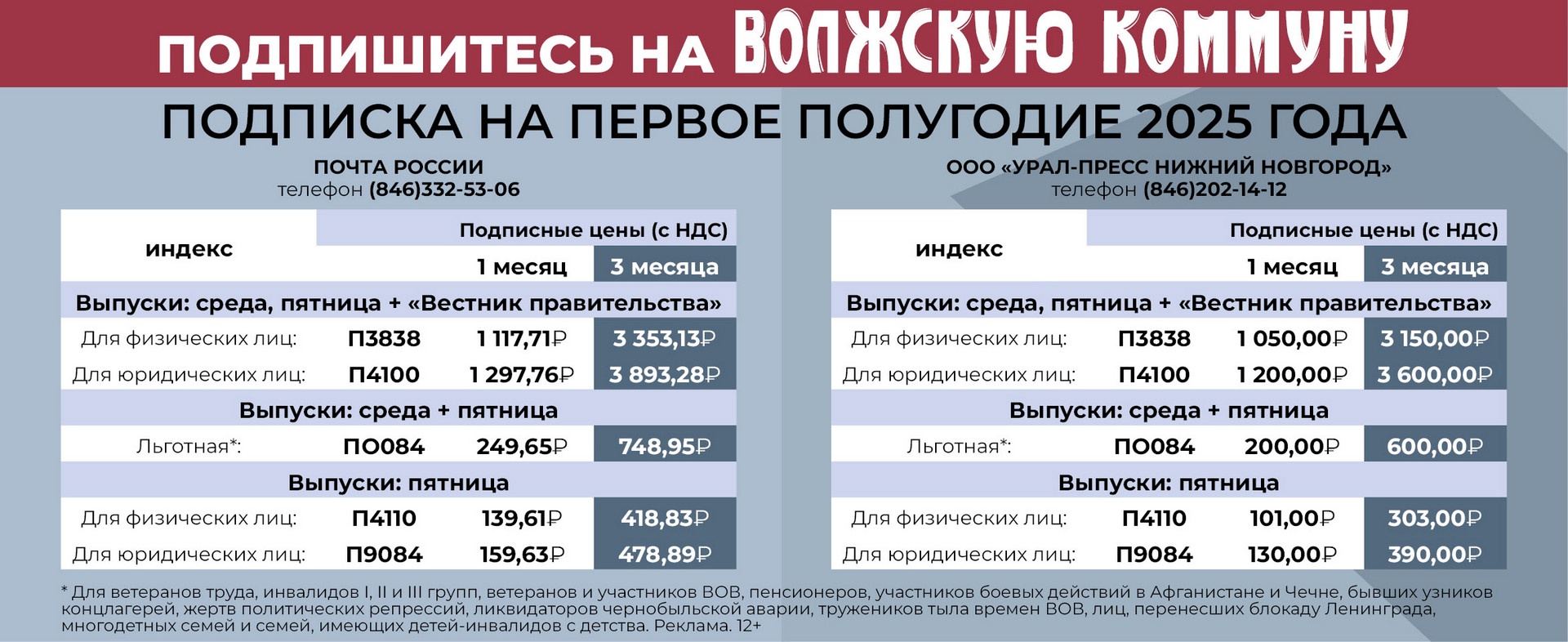 Оформить подписку на газету "Волжская коммуна" вы можете в отделениях "Почты России" и "Урал-Пресс Поволжье" или по указанным номерам телефонов.