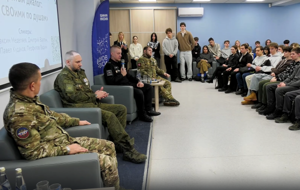 Защитники Родины, среди которых участники и выпускники губернаторской программы "Школа героев" (16+), честно говорили с учащимися вуза о службе и о патриотизме. Отвечали на вопросы и делились личным.