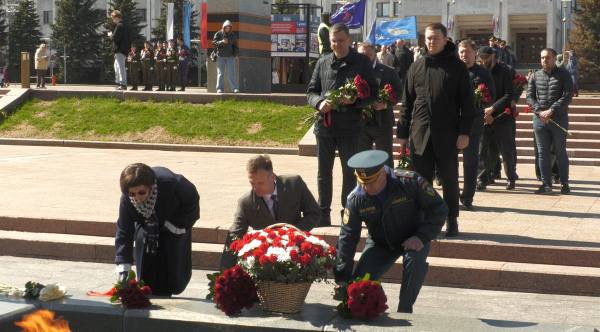 Их подвиг, а также память погибших сегодня почтили минутой молчания. Участники акции возложили цветы к Вечному огню и горельефу "Скорбящей Матери-Родине" на площади Славы.