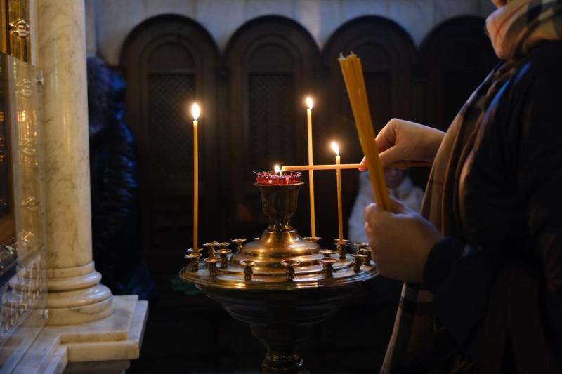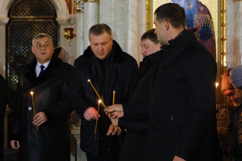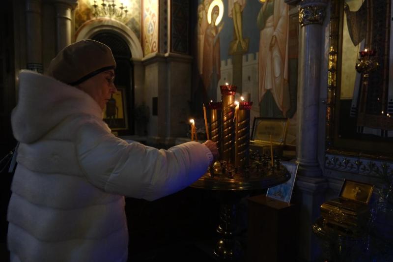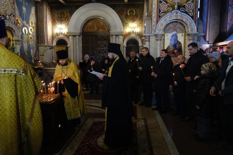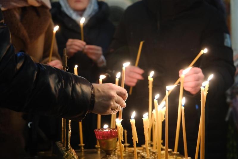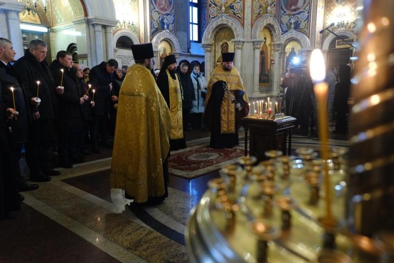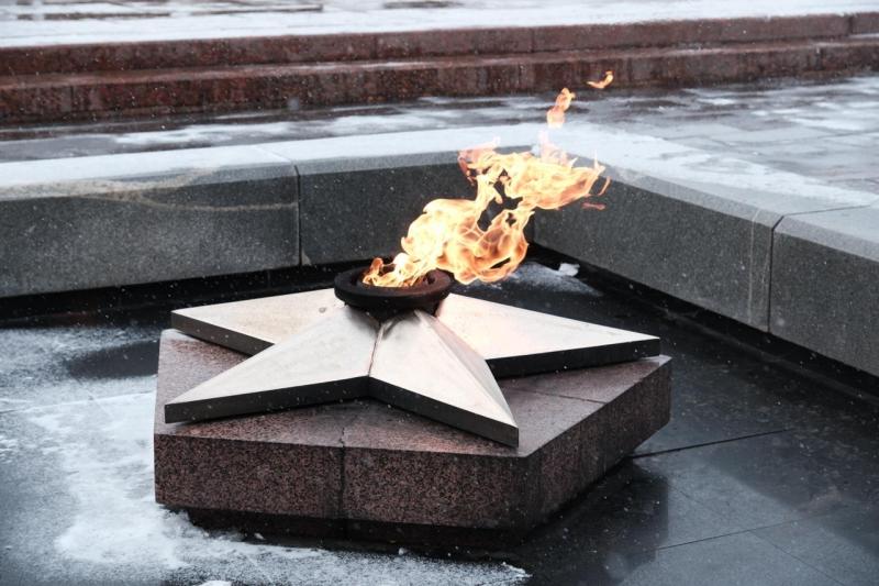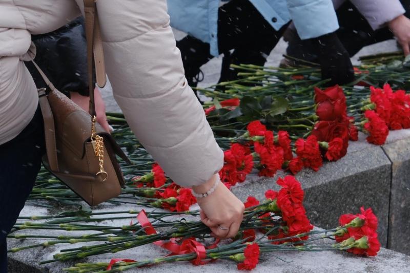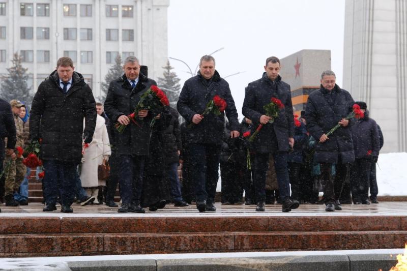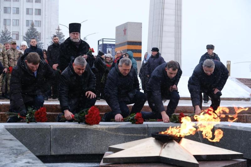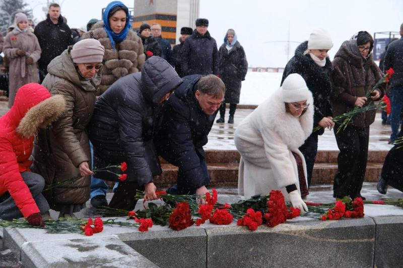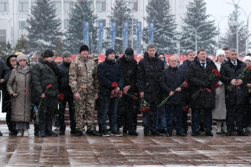 В храме в честь святого великомученика Георгия Победоносца прошло богослужение, затем члены семей, друзья, сослуживцы и просто неравнодушные самарцы возложили цветы к Вечному огню и горельефу "Скорбящей Матери-Родине".